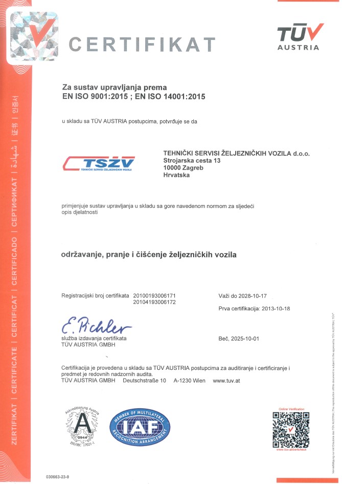 Certifikat za sustav upravljanja EN ISO 9001:2015, EN ISO 14001:2015