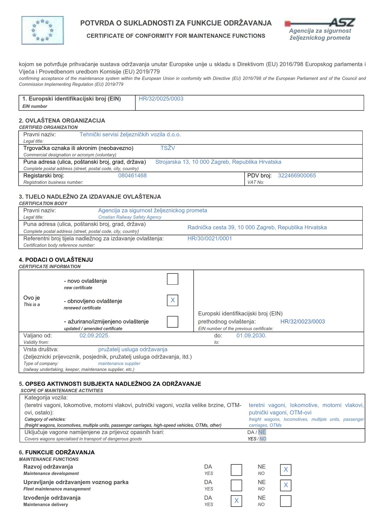 ECM certifikat - Potvrda o suglasnosti za funkcije održavanja